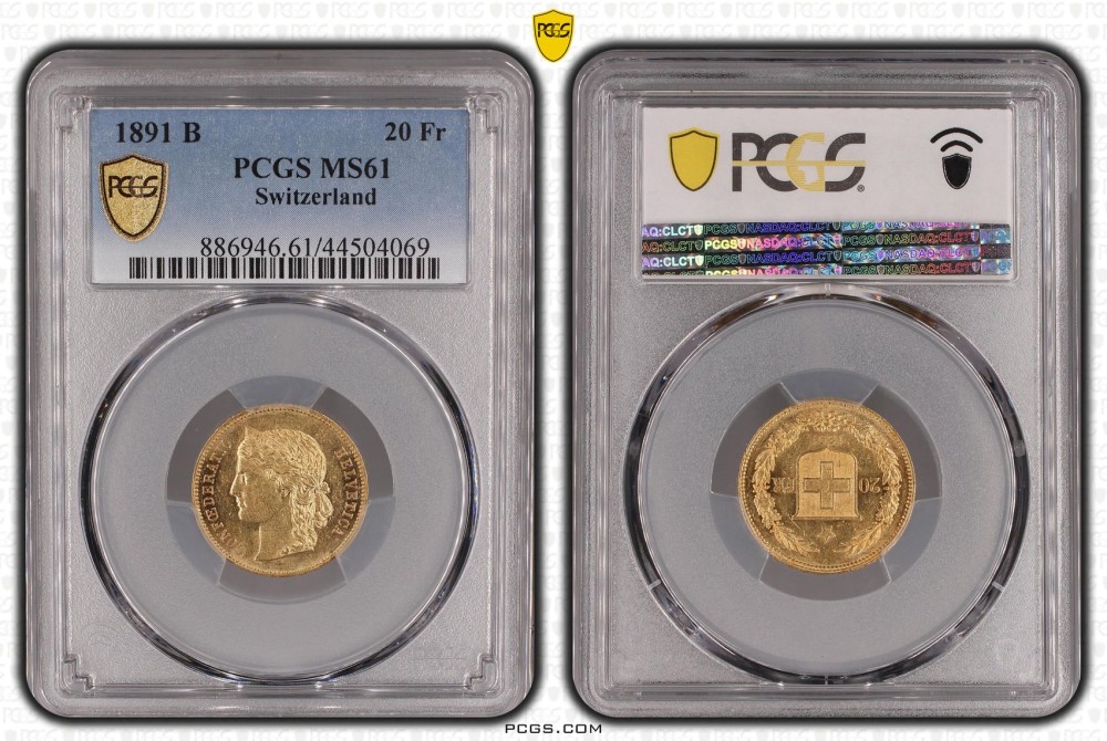 20 Франка 1891 MS 61 PCGS Хелветика