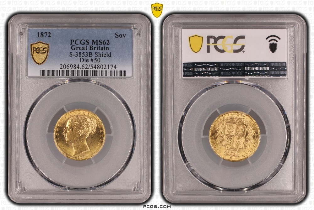 - Соверен 1872 Щит Die#50 MS62 PCGS