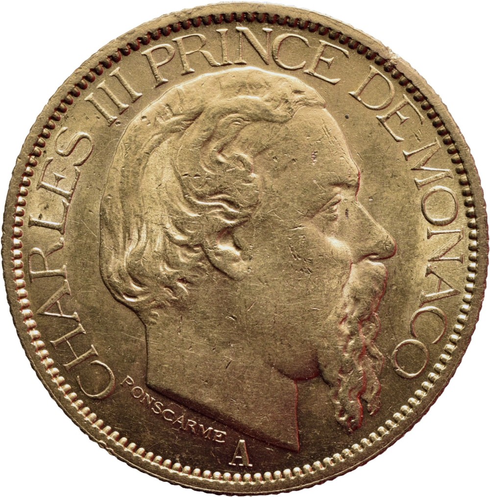 On the reverse – the coat of arms of Monaco, crowned and surrounded by the collar of the Order of Saint Charles, with the legend "DIEU ET MON DROIT" and the denomination 100 FRANCS 1884.